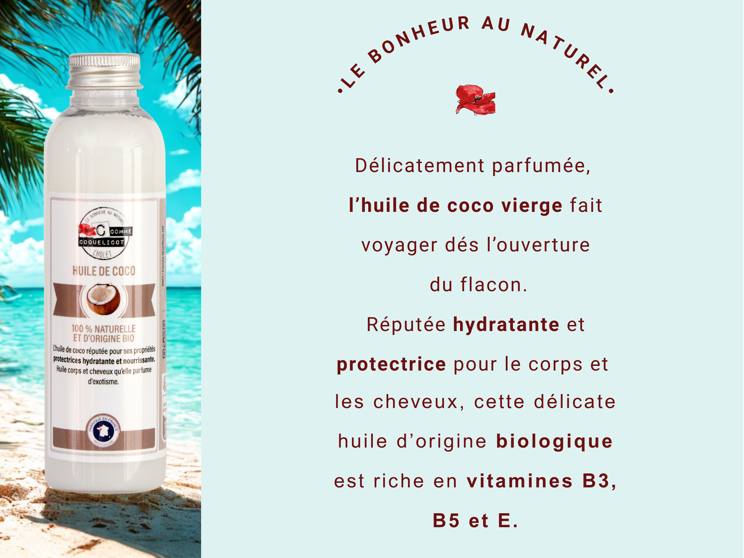 Notre huile végétale de coco 100 % d’origine BIO (150 ml) vous fera voyager dès l’ouverture du flacon. C’est une huile hydratante et réparatrice pour les peaux et cheveux assoiffés. À utiliser telle quelle pour un rendu satiné et lumineux ou en masque réparateur et adoucissant pour le corps et les cheveux.