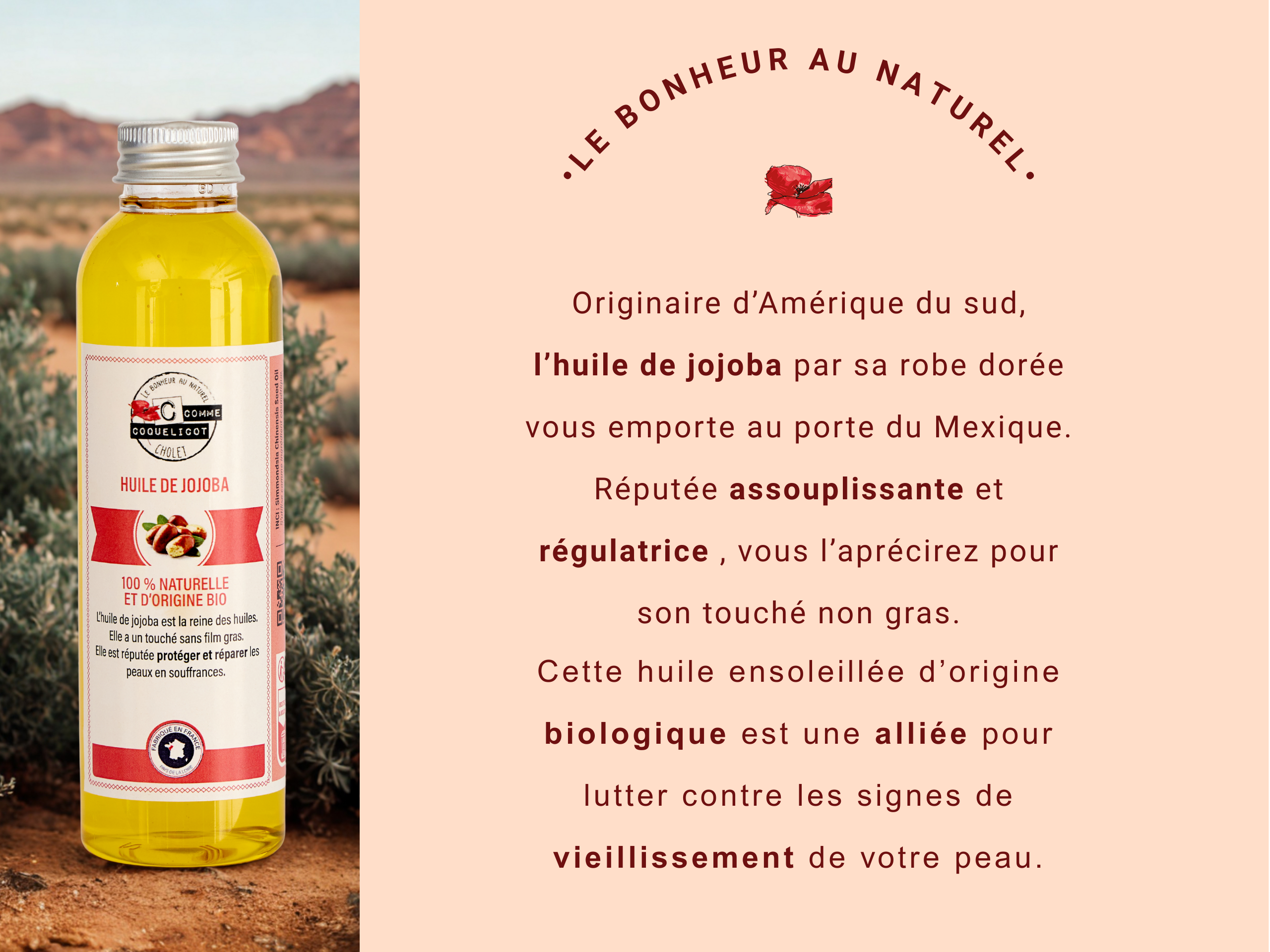 Notre huile végétale de jojoba 100 % d’origine BIO (150 ml) vous emporte au Mexique avec sa belle robe dorée. L’huile de jojoba est une huile que l’on apprécie pour ses propriétés protectrices, émollientes et adoucissantes. C’est l’huile réparatrice par excellence.