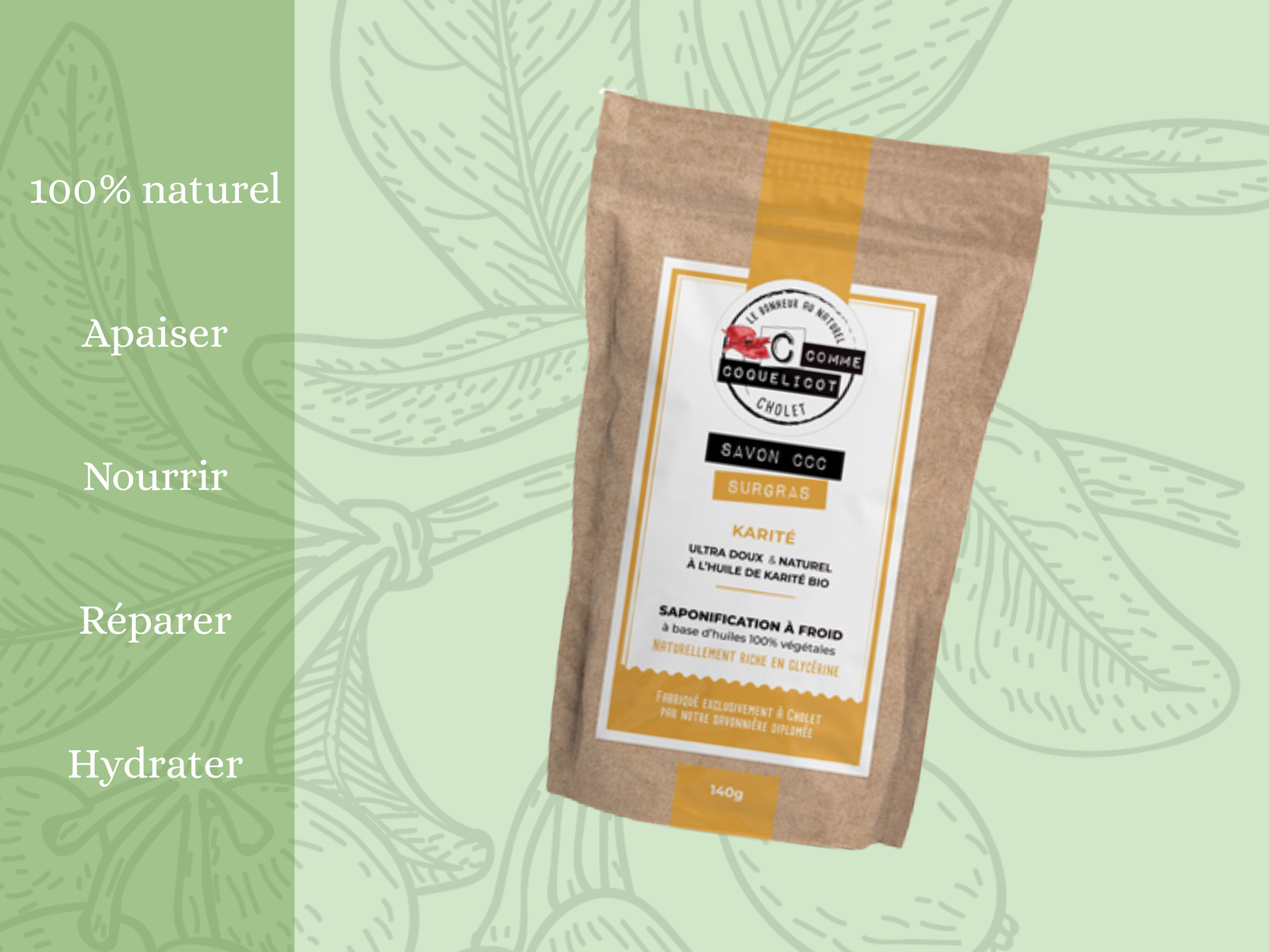 Le savon surgras au beurre de karité est l’allié des peaux abîmées, à qui le beurre de karité en surgraissage va apporter soulagement et réparation.