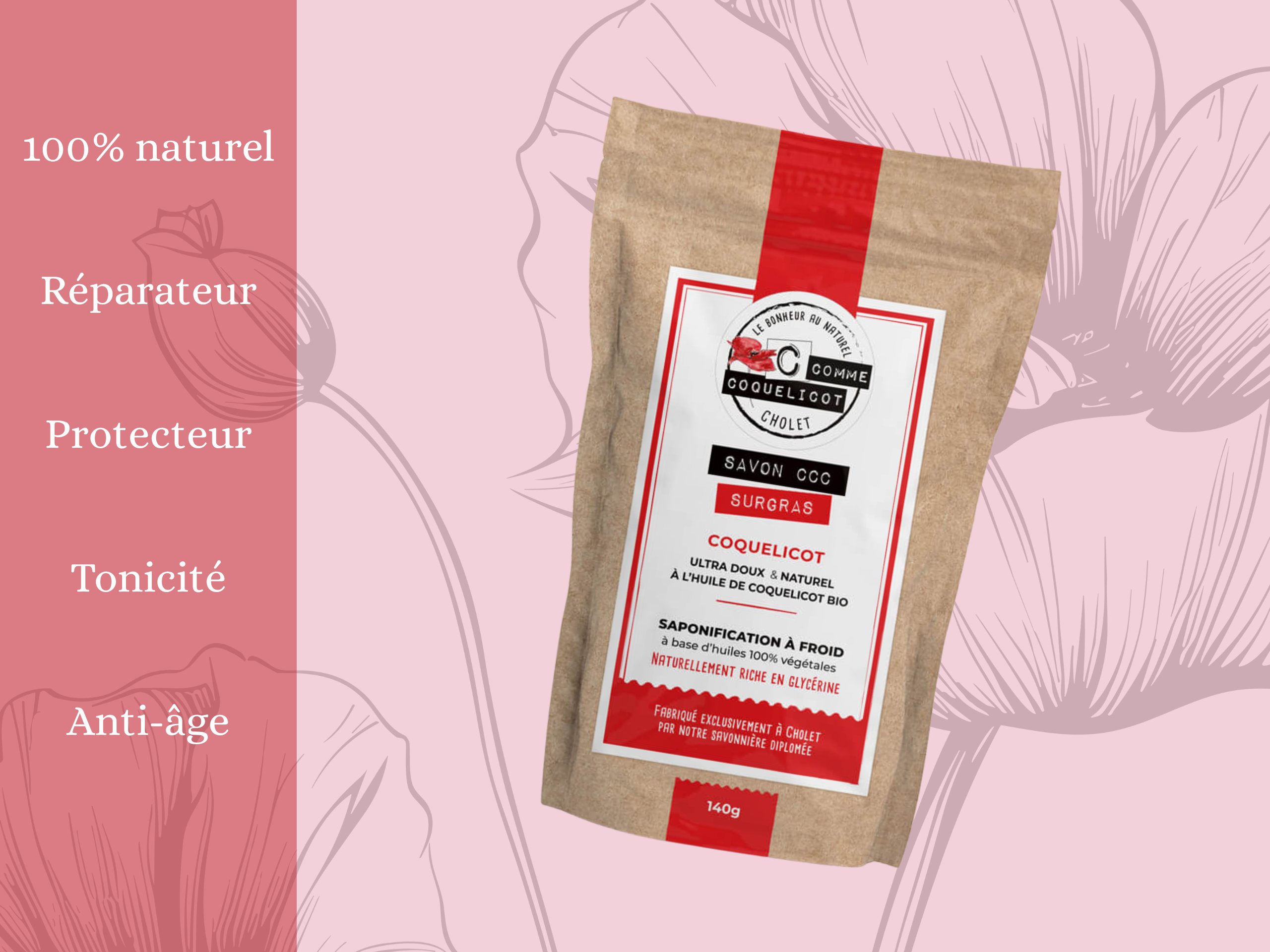 Le savon C Comme Coquelicot hydrate et nourrit grâce à son surgraissage, un excès d’huile de coquelicot, idéal pour les peaux normales à mixtes.