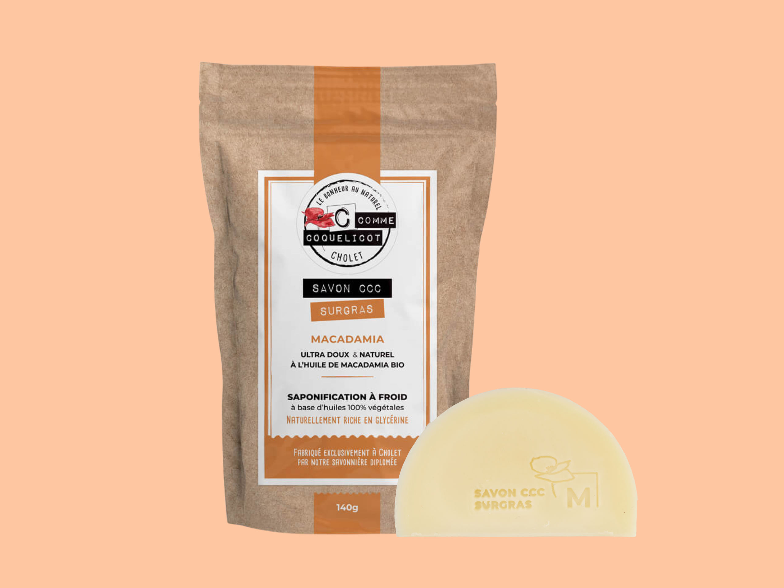 Le savon C Comme Coquelicot répare, assouplit et régule grâce à son surgraissage, un excès d’huile de macadamia, idéal pour tous les types de peau.
