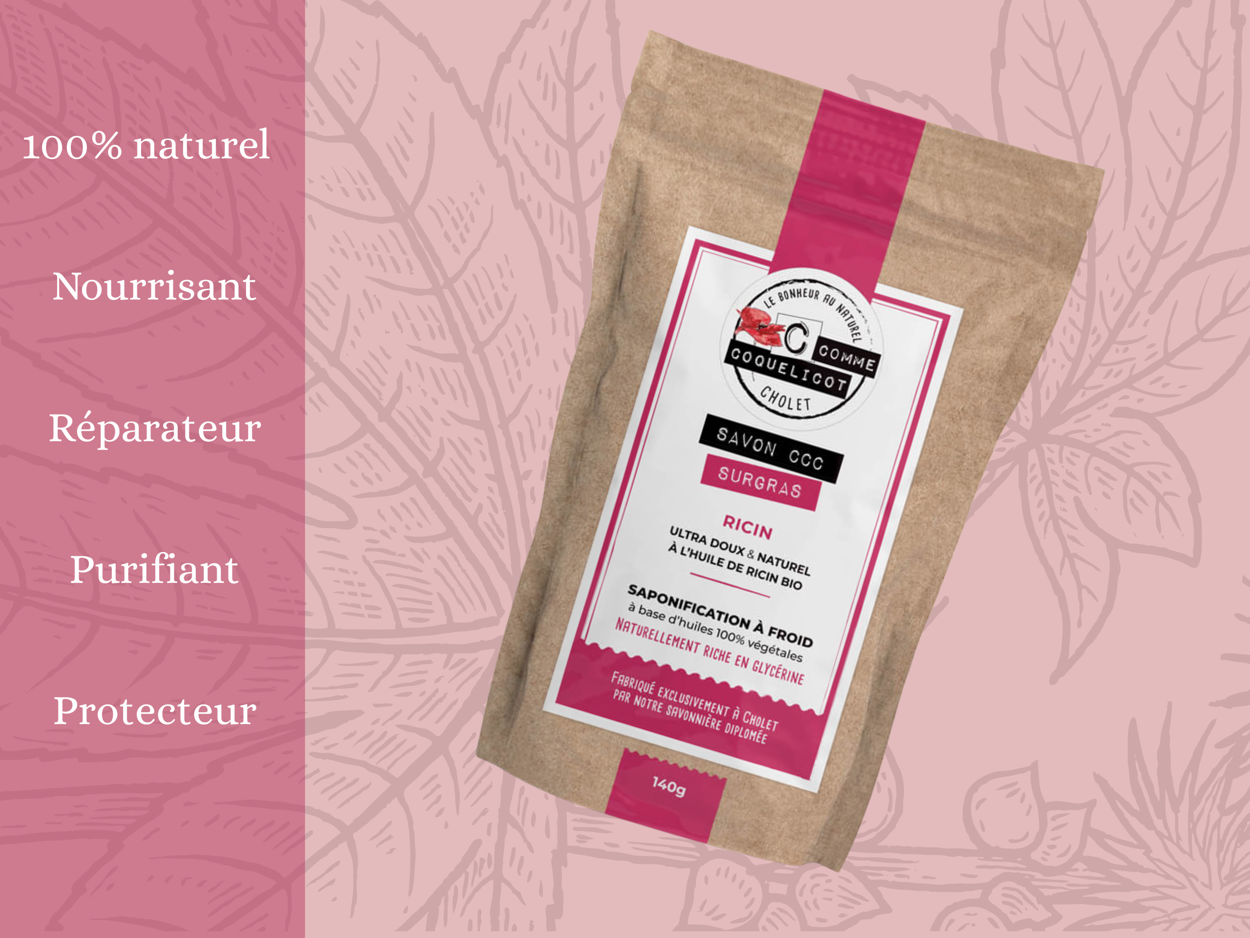 Le savon C Comme Coquelicot répare, assouplit et régule grâce à son surgraissage, un excès d’huile de ricin, idéal pour tous les peaux sèches et abimées.